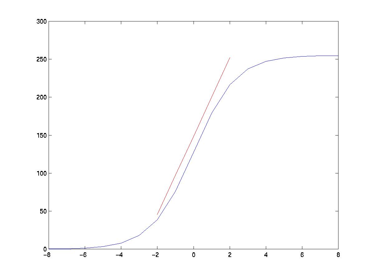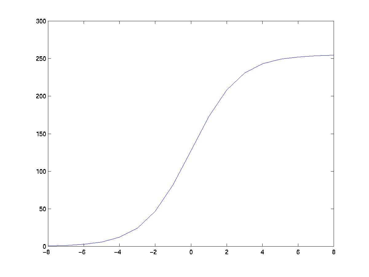 To obtain values for the digital camera, a uniformly gray image is taken with the digital camera at different exposure levels. The camera we used allowed us to vary the exposure levels between -2 and 2. The images taken are uploaded and the average pixel intensity at each exposure level is calculated. The graph below is obtained from these average values, and extrapolated. However, since pixel intensities vary between 0 and 255, at exposure levels below the cutoff, the pixel intensity is set to 0, and likewise for the upper cutoff value at 255.