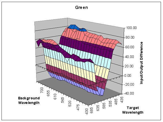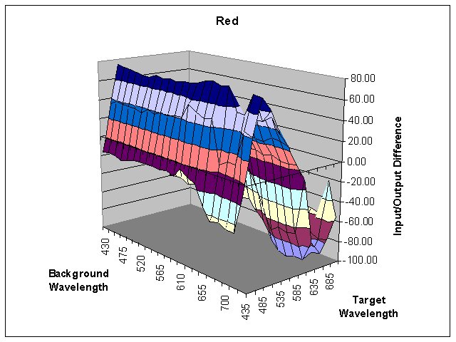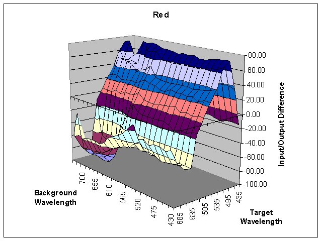 The long background wavelengths cause the Red values to dip by almost -100 and the Blue values to rise