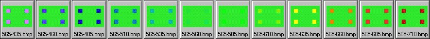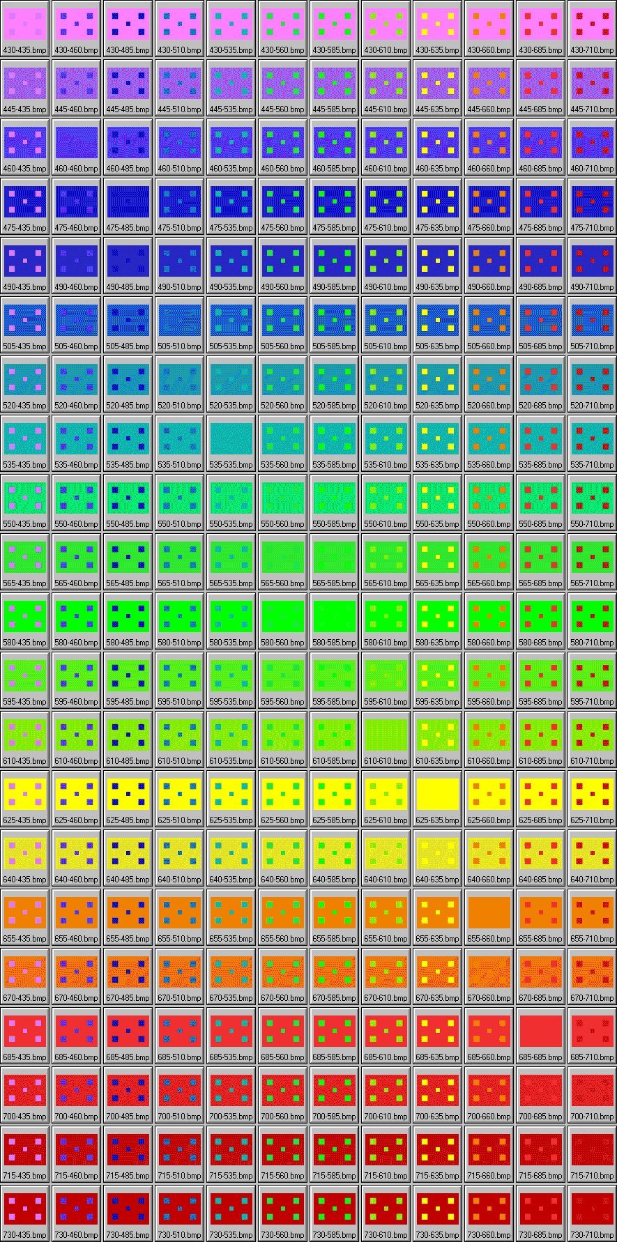 Together these sets of images were used to determine whether the camera makes use of just the center of the image when performing color balancing. Both sets were varied in target color from 435 nm to to 685 nm.