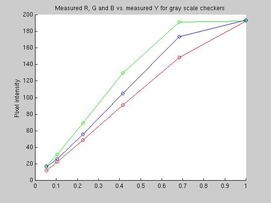 This final plot shows the response of the red, green and blue channels to the grayscale MacBeth color checkers, after I attempted to set the exposure and color gain settings on the image sensor. The plot shows the the imager response is indeed linear until the pixels saturate. The saturation value, curiously, is not 256, but something less. From the plots, it is clear that the responses are extremely linear until the green and then blue and red channels saturate. The autoexposure had been fixed and the gain for the different color channels adjusted to give what looked like a pretty good distribution (from histogram data). Even so, I didn't get it exactly right. The good news is that only two of the grayscale values and one of the other color checkers had any saturated RGB values.