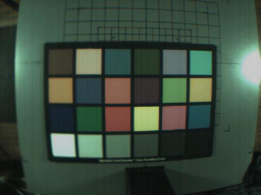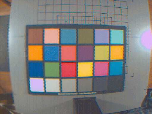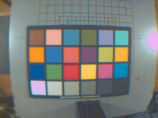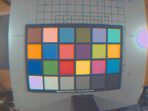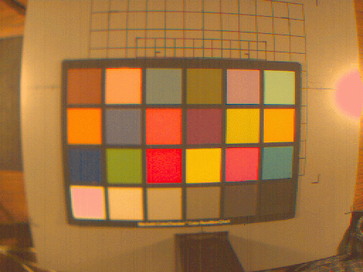 Ok, time for some pictures! First, here's one of the MacBeth color checker images, color corrected and processed for display on a generic monitor. The colors in these pictures look pretty good to me, but there are artifacts due to the simple Bayer interpolation (the wierd fringes on the checkers, for example), and incorrect gain and exposure settings (areas that saturated, like the reflection of the light and the white MacBeth checker, transform to wierd colors).