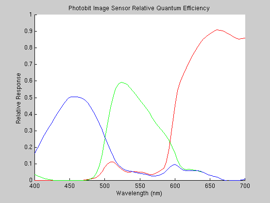 Shown below is the relative quantum efficiencies of the red, green and blue pixels on the Photobit PB159DX. This accounts for the transmission of the color filters as well as the quantum efficiency of the photodetectors. Notice that the imager is much more sensitive to longer wavelength light.