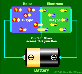 Free electrons moving across a diode fall into empty holes from the P-type layer. This results in a release of energy in the form of photons. |