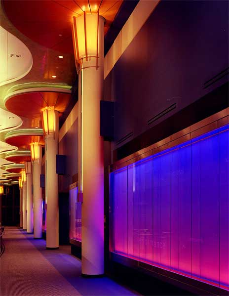 Color Kinetics use RGB LED arrays in combination with digital controllers to provide full spectrum accent lighting that can seamlessly change in concert with music or images to provide a unique lighting show.