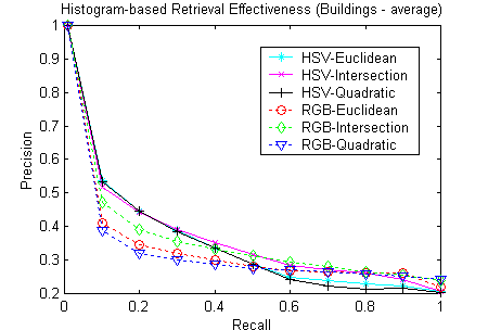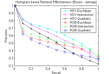 Figure 10. Histogram-based Retrieval Effectiveness (Buildings) Figure 11. Histogram-based Retrieval Effectiveness (Buses)