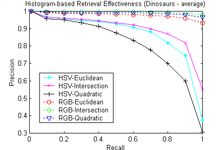 Figure 12. Histogram-based Retrieval Effectiveness (Dinosaurs) Figure 13. Histogram-based Retrieval Effectiveness (500 images)