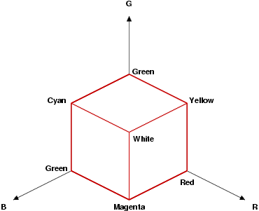 The RGB color model is composed of the primary colors Red, Green, and Blue. This system defines the color model that is used in most color CRT monitors and color raster graphics. They are considered the "additive primaries" since the colors are added together to produce the desired color. The RGB model uses the cartesian coordinate system as shown in Figure 1. (a). Notice the diagonal from (0,0,0) black to (1,1,1) white which represents the grey-scale. Figure 1. (b) is a view of the RGB color model looking down from "White" to origin.