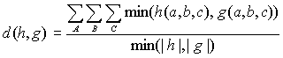 The color histogram intersection was proposed for color image retrieval in [4]. The intersection of histograms h and g is given by: