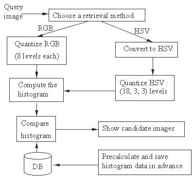 In the figure above, once a query image and a retrieval method are chosen by users, the rest of whose process is done automatically. However, the histogram data for all images in database are computed and saved in DB (Database) in advance so that only the image indexes and histogram data can be used to compare the query image with images in DB. The six retrieval methods used in this experiment are all based on histogram distance measures introduced in equations (4)~(8). The three histogram distance measures are used in RGB color space and in HSV color space separately, which makes up the six retrieval methods. However, each color space requires different processing to the query image and images in DB. All processes were realized using MATLAB. The following sections explain the experiment in detail.