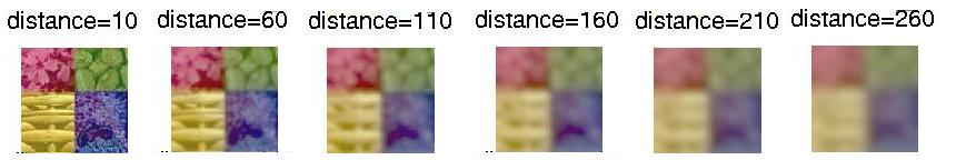 Using the functions provided in the S-CIELAB toolkit, we construct a series of images that are increasingly blurred by assuming that we're viewing the image from increasing distances. We can think of the tower as how humans might foveate on an image first view from the periphery by first bringing it to the central field of view and then by walking closer to it to look at its details. The following series of images shows the perceptual tower created from the example image (distances are measured in inches):