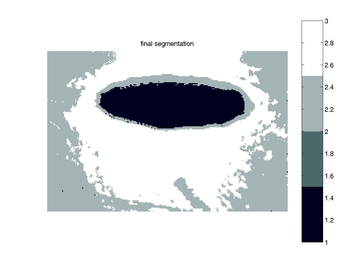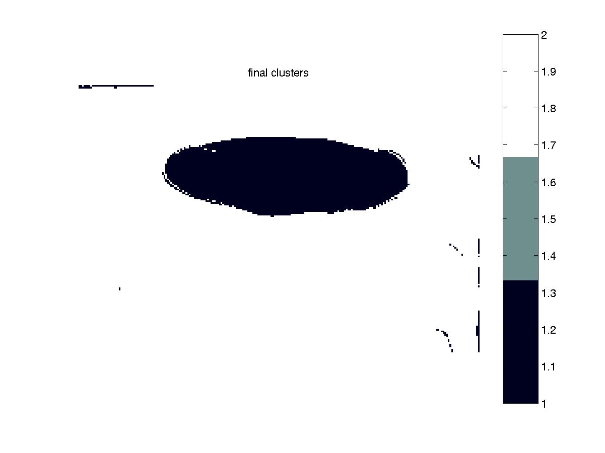 With this new smaller set of clusters, we next need to calculate probabilities to begin the multiscale probabilistic relaxation process. These probabilities, or "confidences", are calculated according to the formulas presented in [1] for every pixel-cluster pairing. The set of core clusters are then formed by assigning any pixel with confidences over 80% for a cluster to that cluster.