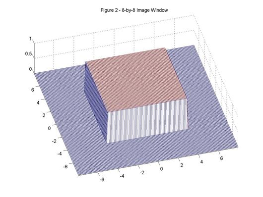 Figure 1 describes the JPEG image compression process. In the first step of the process, the image is windowed using an 8-by-8 rectangular window. A graphic representation of the window is shown in Figure 2. The discrete cosine transform (DCT) separates the image block into spectral sub-bands. The DCT is similar to the discrete Fourier transform: it transforms a signal or image from the spatial domain to the frequency domain. With an input image, A, the spectral coefficients, B, are [2]: