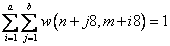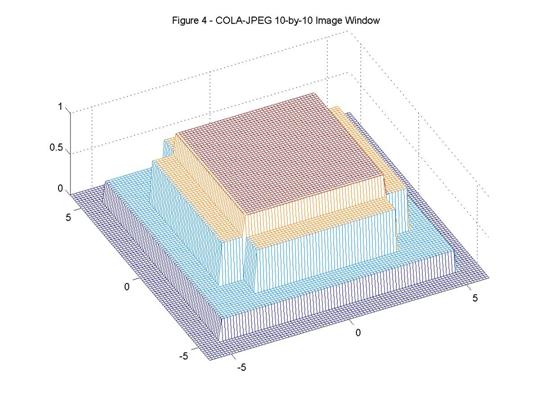 The COLA window is 10-by-10 pixels, has a maximum magnitude of one, a minimum magnitude of one quarter, and a third magnitude of three quarters. The window as created such that if one overlapped the window with itself, with a hopsize of eight, and added, the sum would be a constant value of one. Mathematically,