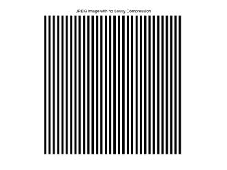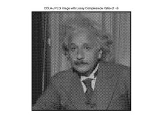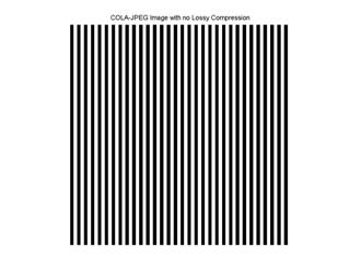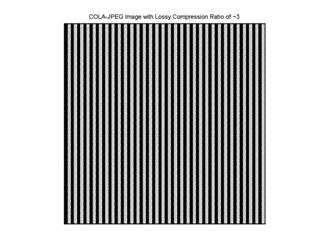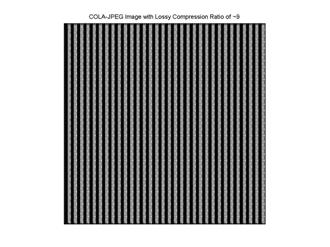 With no compression, as predicted, there is perfect reconstruction. At a compression ratio of 3, the COLA-JPEG is darker than the JPEG. Additionally, the COLA-JPEG appears to have a slight periodic pattern overlaid on top of the image. At a compression ratio of 3, the JPEG is clearly better. At a high compression ratio, where the COLA-JPEG was designed to be better, COLA-JPEG continues to be darker than the JPEG. Additionally, the COLA-JPEG still has the periodic pattern overlaid on top. The COLA-JPEG, however, may be superior to the JPEG in recognizably. Recognizably is a subjective measure, but look at the image a while and it may become evident that Einstein is easier to recognize in COLA-JPEG at a compression ratio of 9 than the JPEG at a compression ratio of 9. It is evident that another test picture is needed to evaluate further the differences in the COLA-JPEG and the JPEG. Figure 6 presents this comparison with a vertical strip pattern.