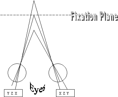 The ability to create such 3-D images in 2-D planes is based on the inherent nature of how our eyes view the world from slightly different, offset perspectives. Stereopsis is the ability of our brain to perceive depth from two images presented to each eye. Light enters the eye and impacts the foveas of both retinas. As displayed in the diagram below, images that are at the same location on each eye lie in what is named the fixation plane. Images that are further (X), on (Z), or closer (Y) to the fixation plane will cast disparate images on the foveas, which are interpreted by the brain as depth. This type of depth cue falls under the category of a binocular depth cue, which requires both eyes.