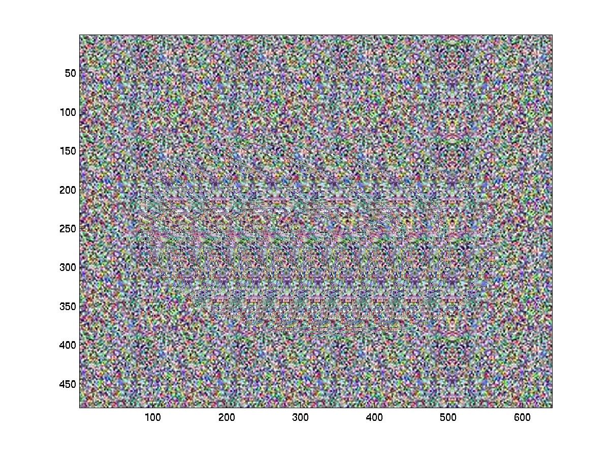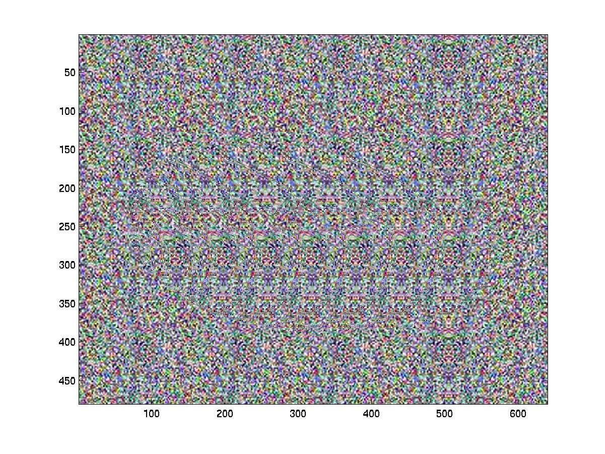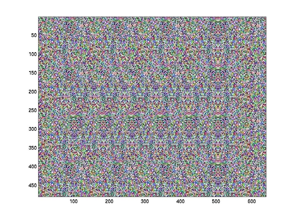 From the two images above, it should be apparent that the patterned image is much easier to view than the random dot stereogram. This is due to the color that is inherent in the pattern design. The two above images are for m=1/3, which corresponds to the depth of image. The following few images vary the value of it from 0.1 to 0.7, the images are more difficult to perceive since our eyes do not converge as well at higher depths.