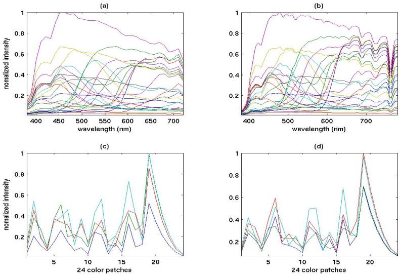 simulated spectral responses of ideal color-patches, (b)