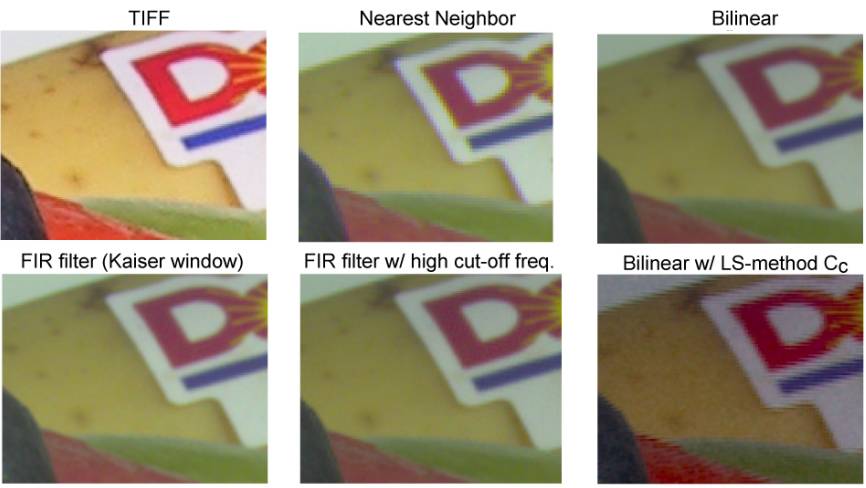 Demosaicing Results II. FIR filter with Kaiser Bessel window (b = 8) was using cut-off frequency of 0.25 (left figure) or 0.35 (middle figure) Nyquist frequency; note that the maximum cut-off frequency possible is 0.5 Nyquist frequency where Nyquist frequency represents 1/pixelwidth. Nearest Neighbor Replication method with CMYG pattern cannot be done in uni-direction (see Fig. 1). Therefore, the result is better than the one shown in previous work [1]. The direct TIFF output looks sharper than FIR filter results (see left figures in Fig. 9 and 10). The possible reason is the sharpening operation in the embedded image-processing pipeline in the digital camera, which amplifies higher frequency components after the demosaicing (i.e., low-pass filtering) process. Note that the possible anti-aliasing filter in front of CFA may have suppressed higher frequency components before the sensor measurements because it is hard for physical anti-aliasing filter to have flat response in the low-frequency pass-band. Conclusions