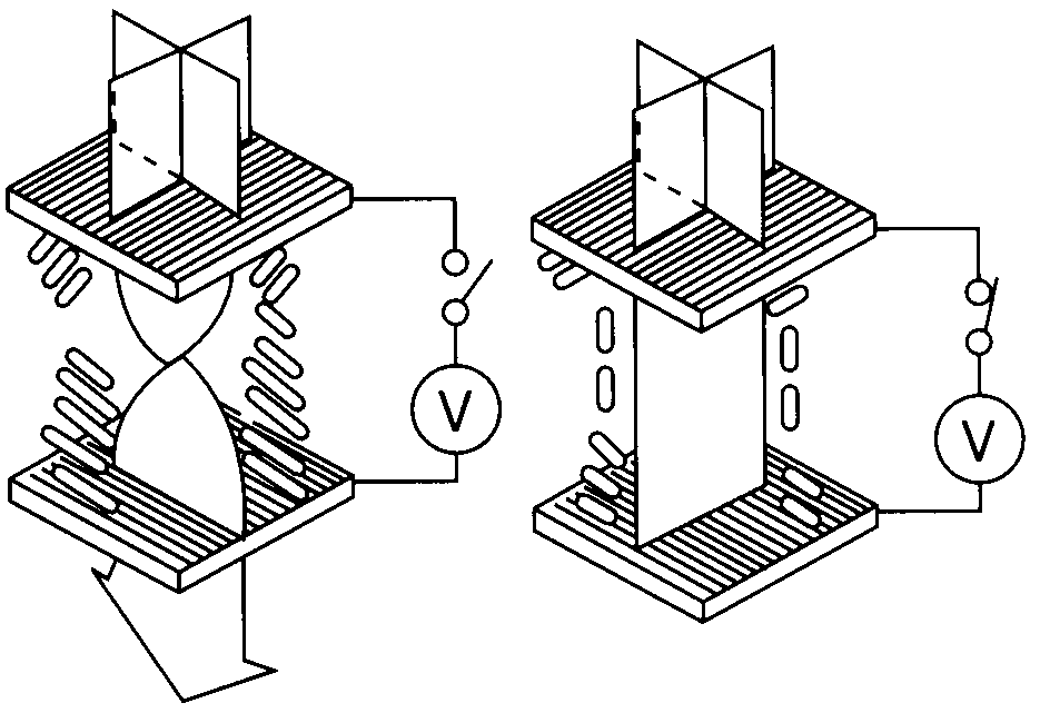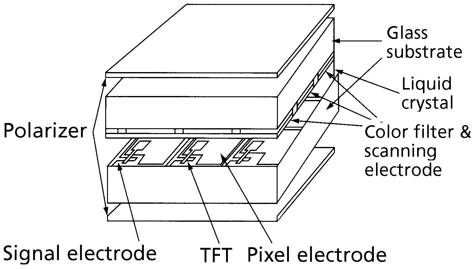 Two crossed polarizers normally do not transmit any light, but if a 90º-twisted LC is inserted in between, light will be transmitted as shown in the left of the figure below. On the other hand, applying an electric field will unwind the helical structure and the LC therfore loses its polarization-rotating characterisics. As a result, the display turns dark.