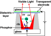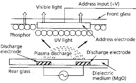 A plasma is generated by applying a certain voltage across two electrodes. The breakdown between these two electrodes is triggered by a very small voltage applied in an address line. When this breakdown occurs, electrons collide with Xe or Ne atoms, exciting them, and thus producing UV light.