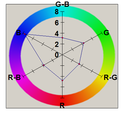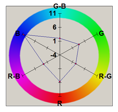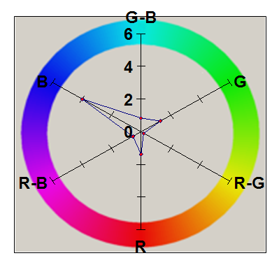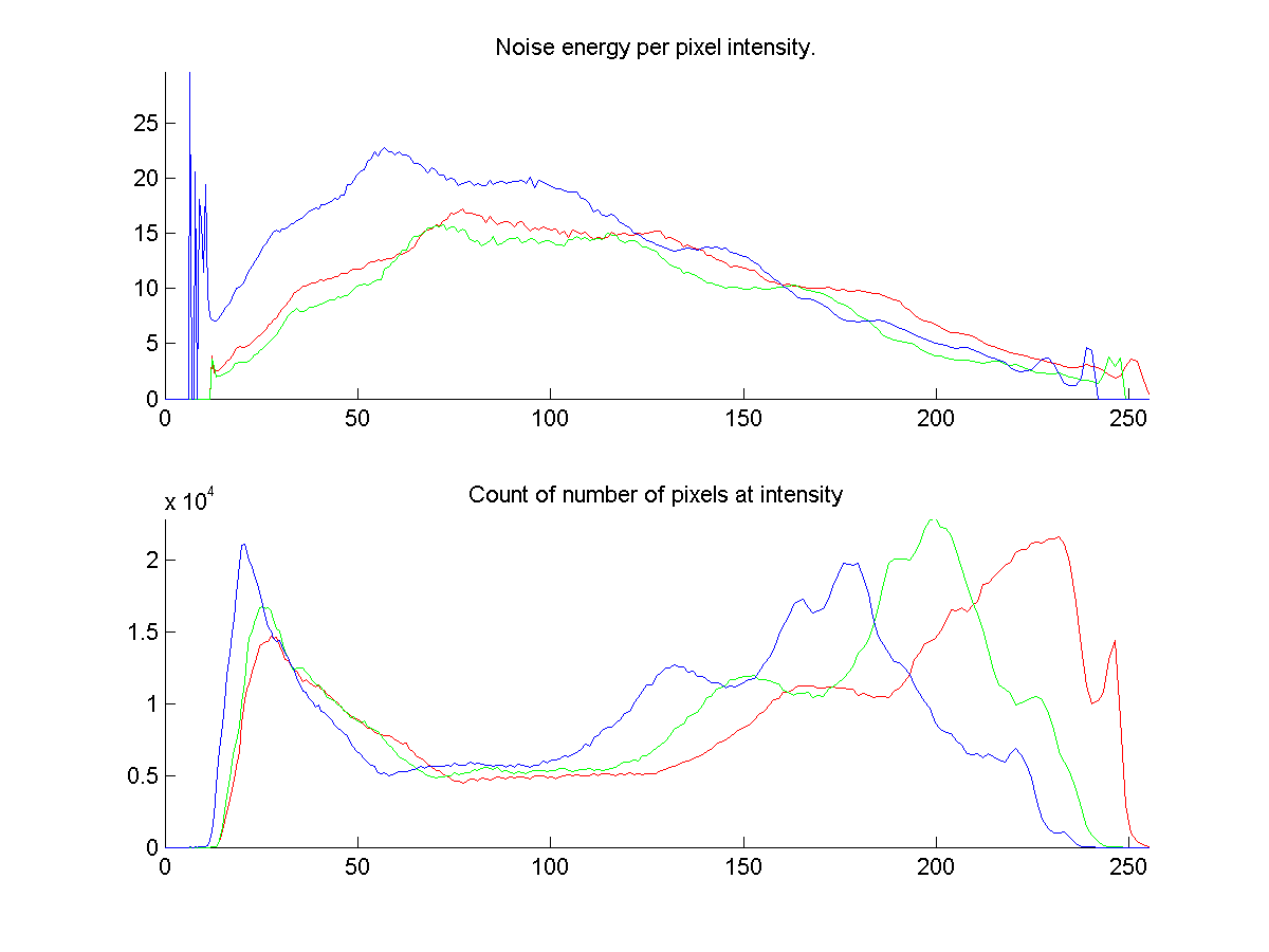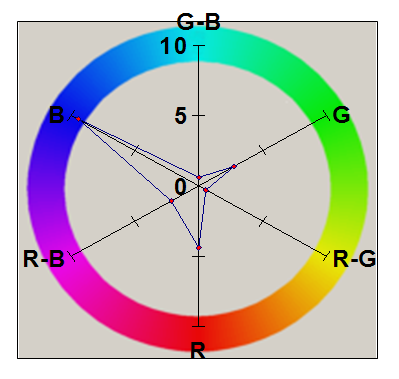 The radar plots below give an interpretation of the spatial noise variance samples. They quantify the average variance of the red, green, and blue channels, as well as the covariance of pairs of channels. Note that all channels have positive covariance. While it is not possible to know exactly what processing steps occur inside the camera, it seems likely that these positive covariances are due to the interpolation of pixels in the CCD color mosaic. The wide spatial patterns of the blue and red channels are evidence of this, since the Bayer mosaic pattern has relatively fewer red and blue pixels, compared to green.