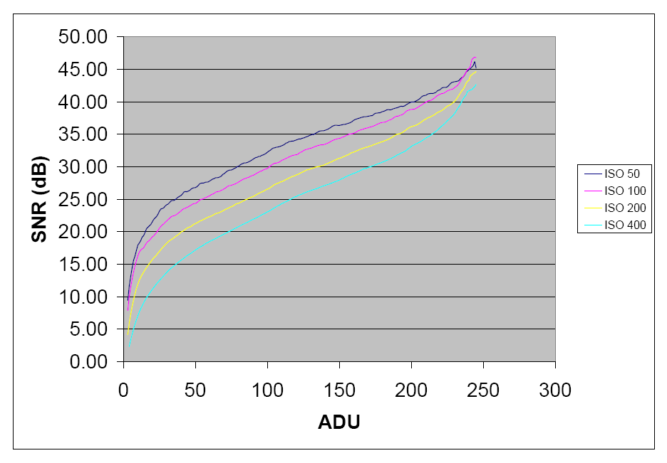 The dark signal nonuniformity (DSNU) experiments show that typical DSNU levels are well below 1 ADU, even for exposure times as long as 1 second. So we see that DSNU is not a major component of image noise.
