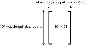 Each of the other 24 surfaces in the Macbeth color checker (shown below in Figure 1.2) produced an analogous set of data. The color signal from 24 surfaces, each with 101 data points, produced a 101 by 24 matrix.