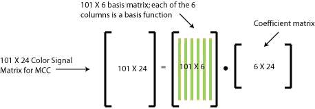 In linear algebra terms, the RGB channels create a representation of the image data using three basis functions. We want to use more than three channels; and we have 101-point data for a standard color chart which represents the entire visual spectrum relatively accurately. The equation below in Figure 1.3 shows an example of a reduction into 6 basis functions.