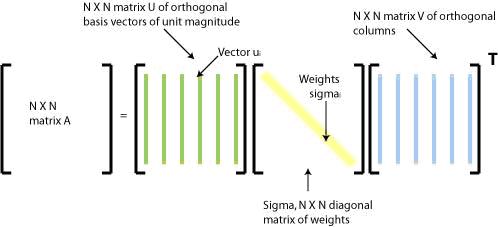 The columns of U form an orthogonal basis, with vectors ordered from greatest to least in their importance. The diagonal entries in Sigma are the weights. We use the basis matrix V to help calculate the SVD, but it is of little value for the results we want. To make SVD easier to visualize, the matrix form of the SVD is also shown below in Figure 1.4.