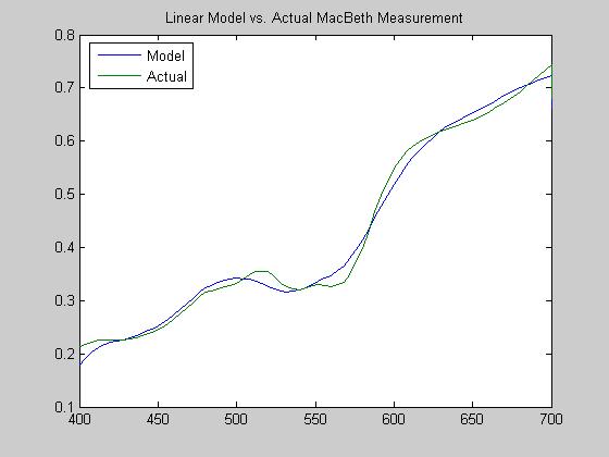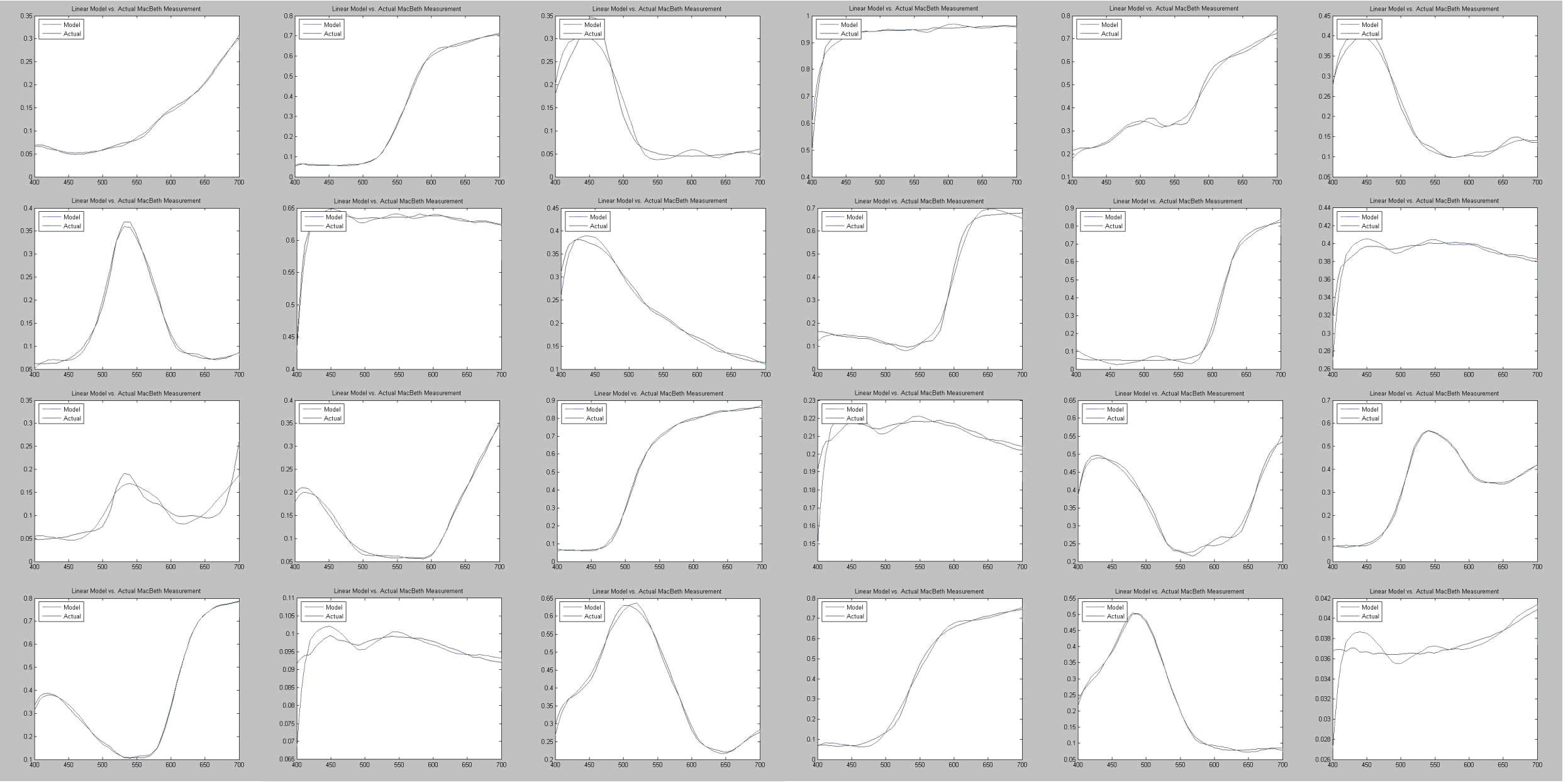 We can use a least-squares approximation to find the 6 by 24 coefficient matrix, since the spectrophotometer data is given and the bases are already determined. Using these values, we can plot the approximate curves for each of the 24 surfaces in the Macbeth Color Checker. Figure 1.7 shows one enlarged plot of approximate and actual surface radiances of one surface and an array of smaller plots of each of the 24 color surfaces in the Macbeth color checker. As shown, the linear model and the measured data seem to be very close with six basis functions. This indicates that the linear model developed in this project is a good predictor of the Macbeth color chart. Since the Macbeth chart is used as a standard for many applications, the linear model is also pretty good at estimating radiances in other surfaces, such as in camera images, as will be shown in the next part.