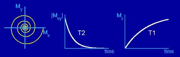 in the transverse plane with time constant T2, while recovering along the z-axis with time constant T1 (figure courtesy of
