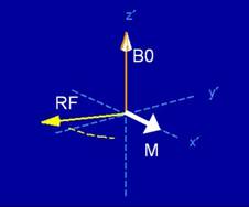 Applying an RF pulse centered at the Larmor frequency causes the magnetization vector (white arrow) to tip