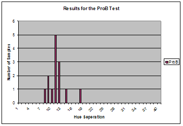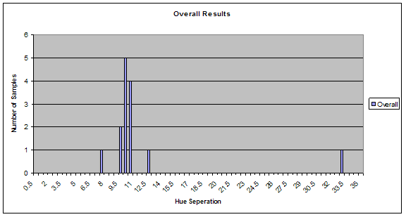 As can be seen from the various histograms, there are significant variation in the color vision abilities of the population, even excluding the color deficient individual. In the overall results, the results are most clear: the color vision abilities of individuals follow a normal distribution, with the majority of people someone around the mean, and a few outliers on either sides of the vision ability spectrum.