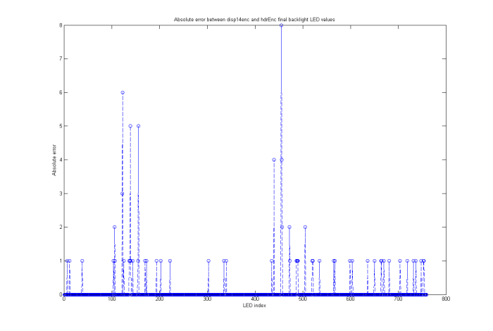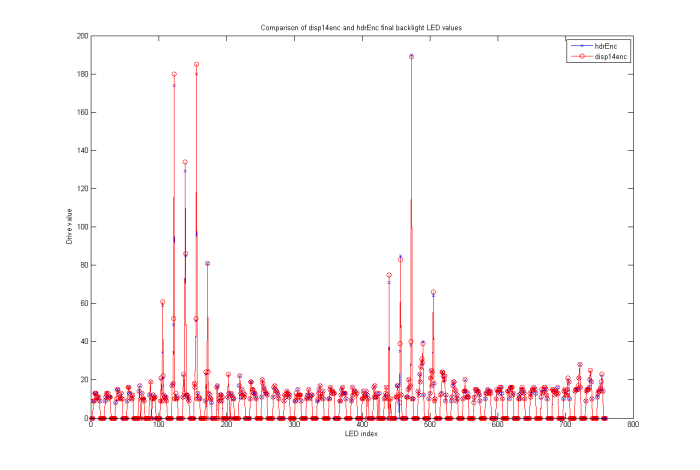 For this comparison, the Memorial Church scene was encoded with both the shell script disp14enc and the Matlab version hdrEnc. The two framebuffer images were then compared. First below is the comparison of the LED backlight drive values. The x-axis is the LED index, and the y-axis is the framebuffer value. Since the framebuffer is 8-bit, the LED values range from 0-255.