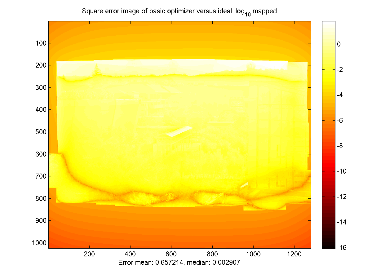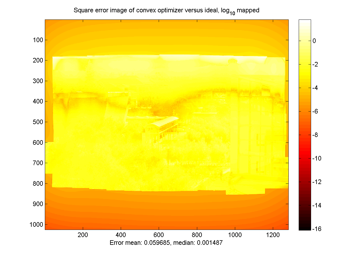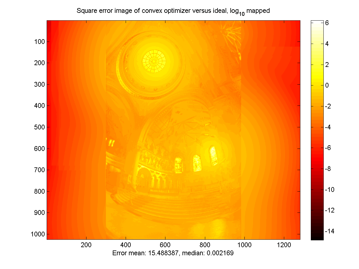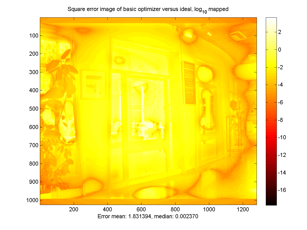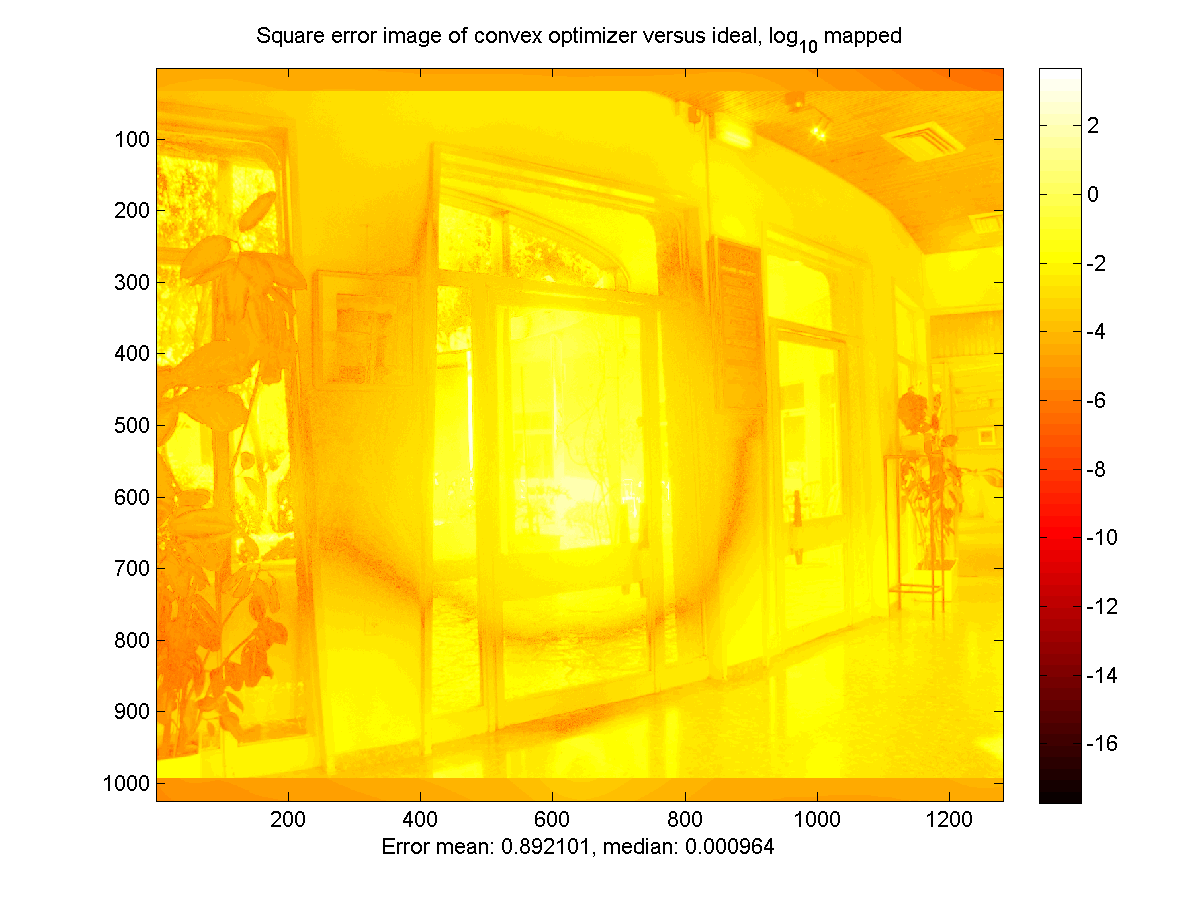 Below are the simulation results for the Brightside encoder (BS) and the convex optimization encoder (CO), compared to the 'ideal' result generated by rescaling the source HDR image to fit the Brightside panel. All images were normalized to have a mean of 1, and then a sequence of exposures was generated to allow viewing of the entire dynamic range. The exposure factors are powers of two, with the number in the boxes below indicating the exponent. The final two images are the mean-square error images comparing the encoded images to the source. These are log-scaled to allow the full dynamic range to be visible, with the error of the color channels for each pixel averaged together.