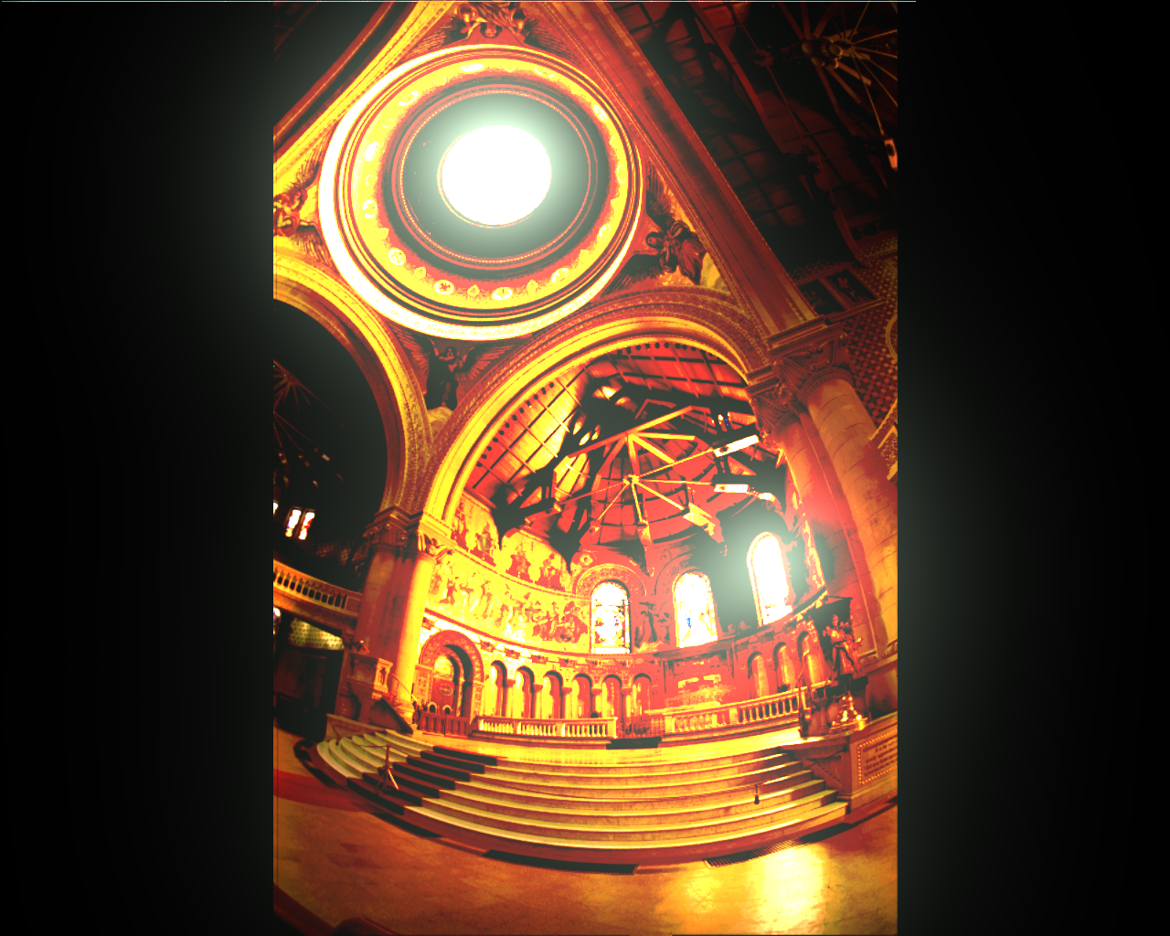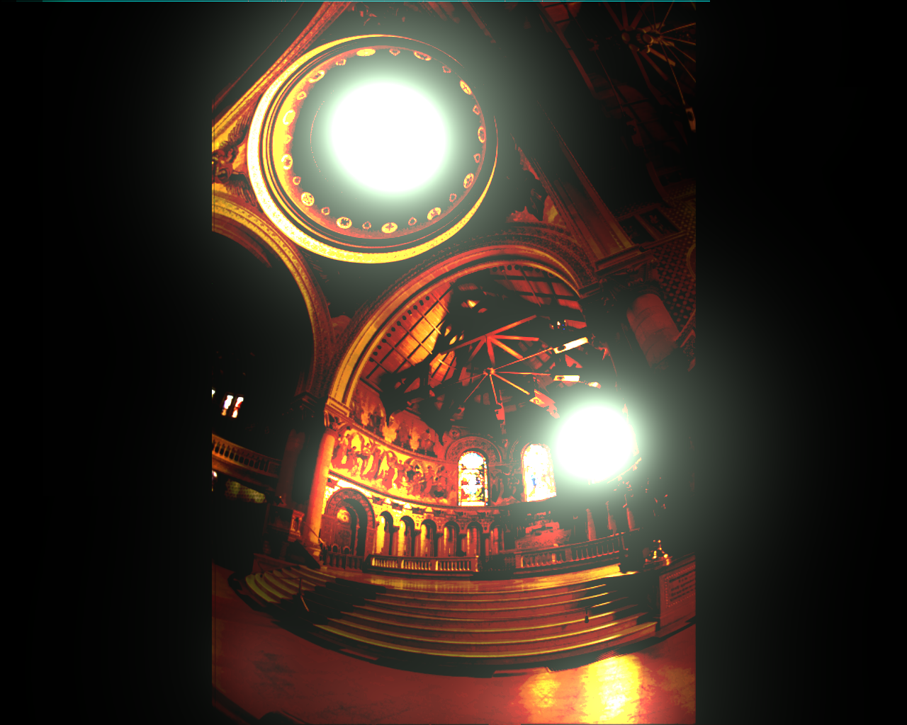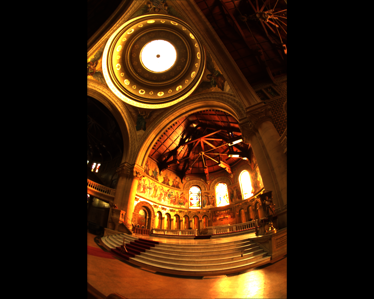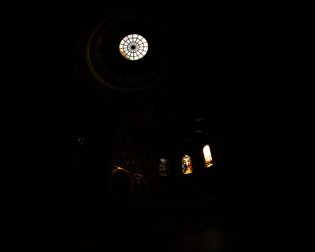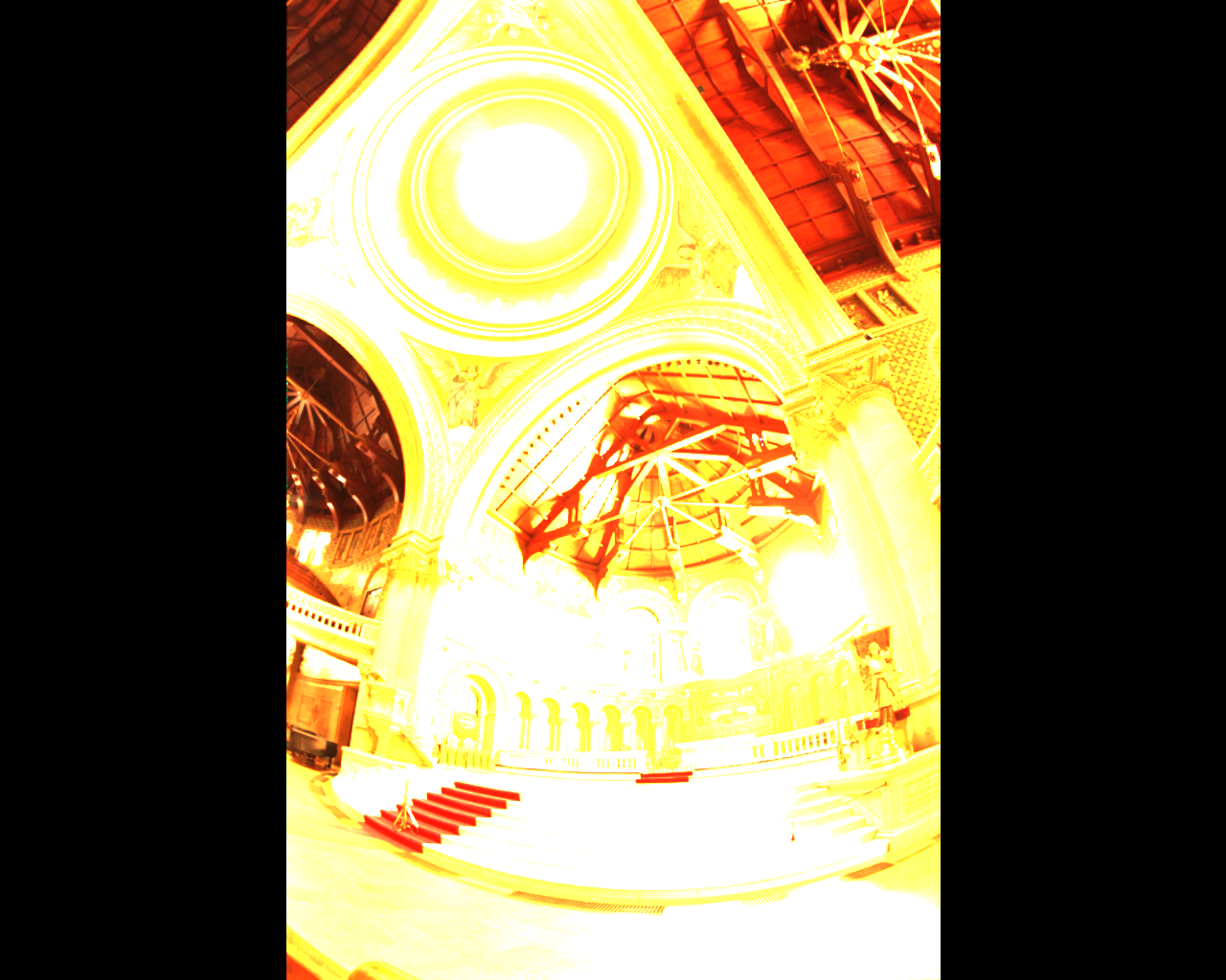 The error between the ideal and encoded images here becomes very large at both the skylight and the rightmost stained-glass window. These are the regions with the highest luminance, and it seems that it exceeds the dynamic range the encoders can successfully code for. Therefore, the error grows very large since the HDR display saturates at a brightness signficantly below what would be required to reproduce the actual dynamic range. This gives rise to a high average error (15.5 for CO, 46.79 for BS), but the median error is still very low (0.0021 for CO, 0.0054 for BS). With the final code, the CO encoder has both better mean and median error than the Brightside encoder,
