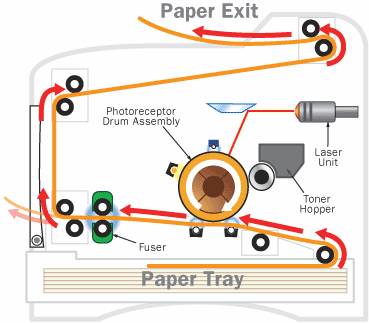 As explained above, the charged toner particles adhere to the negatively charged areas of the drum that have been exposed by the laser. Then, the paper strips the toner off the drum and onto the paper. At that point, the toner is held to the paper by electrostatic forces. Then, the paper with the toner is passed through the fuser. The fuser heats the paper and the toner and causes the toner to melt such that it physically bonds to the fibers within the paper.