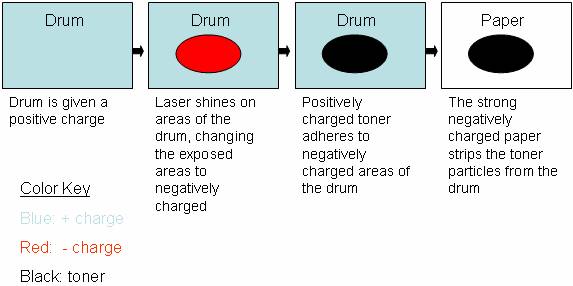 Then, the paper is given a strong negative charge (stronger than that of the drum) and is slid beneath the drum. Since the paper has a stronger negative charge than the drum, it takes the toner off of the drum so that the pattern from the drum is translated to the paper. Then, the paper goes through the fuser and the toner particles are fused into the paper.