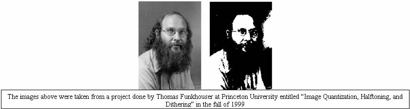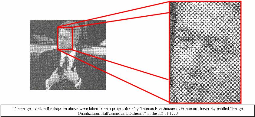 Overall, halftoning techniques are essential to both laser and inkjet printers. Any discussion of printer technologies would be significantly lacking without adequate credit given to the prominent role that halftoning plays in printing both grayscale and color images. As a final example of halftoning consider the following picture printout of Bill Clinton. After scanning in the image and zooming in, one could see that the shades of gray are achieved via the small halftone masks on the right.