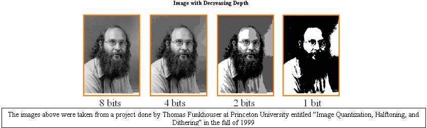 The resolution of every static image depends on intensity resolution and spatial resolution. Intensity resolution is the “depth” of bits for representing intensities or colors within each pixel. Spatial resolution characterizes the number of or “width” x “height” of pixels within each image. For example, a binary output laser printer could have a spatial resolution of 6600x5100 with a depth of 1. One would expect, decreasing depth to look like the following: