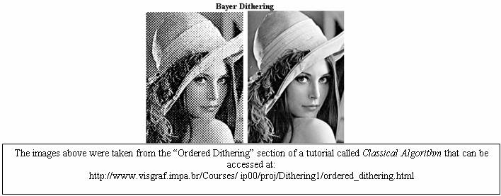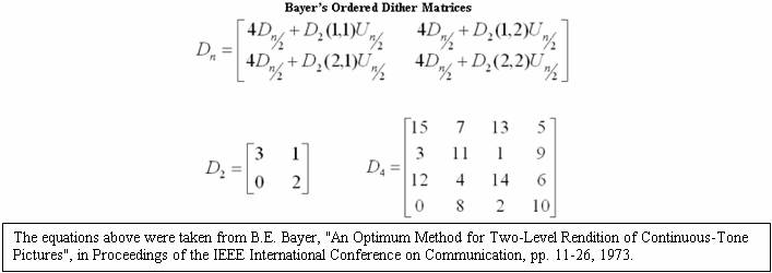 Ordered dithering techniques employ a matrix that contains a pattern of threshold values that can be compared to the pixel intensities to produce the discrete output of the halftoned image. B.E. Bayer showed in 1973 that for matrices of orders which are powers of two (of the type shown below), there is an optimal pattern of dispersed dots which results in the noise being as high-frequency as possible. Since the human visual system is less sensitive to high frequencies, the images look much cleaner.