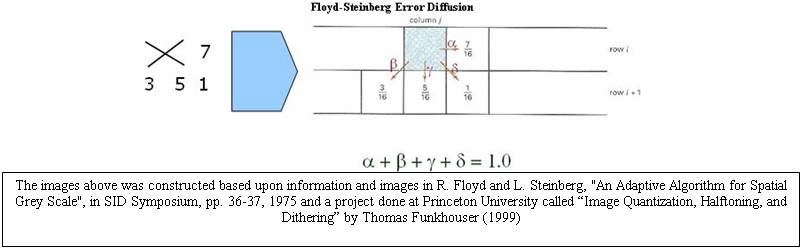 Floyd-Steinberg dithering operates on the principle of error diffusion. It spreads the quantization error over neighboring pixels such that the error is dispersed to the pixels to the right and below as shown in the diagram.