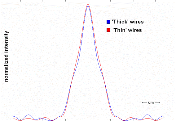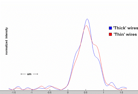 Left: OptiFDTD results; Right: MATLAB results. Validation of the Wire Thickness Approximation Since it was not possible to assign a thickness to wires in the MATLAB code, our test of the wire thickness approximation had to occur entirely in OptiFDTD. We created two pixel setups: one with ‘thick’ wires that measured 0.4 μm in thickness, and one with ‘thin’ wires that measured only 0.05 μm in thickness. If approximating wires as one-dimensional conductors was reasonable, then the ‘thin’ and ‘thick’ wire setups in OptiFDTD should produce almost identical intensity patterns at a depth of 4.8μm from the bottom surface of the microlens. The results were as we expected. As the graph below illustrates, pixels with ‘thin’ wires and ‘thick’ wires behave almost identically under on-axis propagation. Though there is a slight difference in the intensity pattern produced by our approximation, the difference is more of shape than of magnitude, and is negligible for the purposes of our optimization experiment.