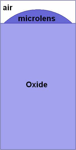 | Abstract Introduction Methods Results Conclusion Appendices | Methods: Simulation and Validation Simulating a Pixel on MATLAB The MATLAB scripts used for the optimization calculations come to us courtesy of Dr. Peter Catrysse. The main script models a 2D cross-section of a pixel with a width of 3.3 μm and height 4.9 μm (not including the microlens height). Light incident on the pixel was represented as a lens illumination rather than a plane wave, and therefore modeled as a cone of light defined by its wavelength (we used 555 nm) and span angle. The microlens, located at the top of the pixel, serves to focus incident light down to the photodiode on the pixel floor, and is modeled in the script as an obstacle with a given curvature, refractive index, and width. Light then propagates through the oxide, again specified by a given refractive index, and encounters the three metal wire layers (each with the same refractive index) modeled as infinitely long, infinitely thin 1D obstacles separated by a gap or aperture of given width. The adjustable parameters are determined by the structural limitations of the pixel itself, and were therefore restricted in this model to changing width and shift of the wire apertures along the x-axis. The MATLAB code executes the propagation of light by using the input parameters of wire shift and location, as well as the given values of pixel dimensions and material properties, to calculate a new angular spectrum and amplitude of complex field of the incident light. The new values of angular spectrum and amplitude, calculated after each subsequent propagation, describes how the wave front has been modified after passing through the designated obstacle. Power is then calculated from angular spectrum and amplitude. What Makes a Good Pixel? Determining the relative improvements in light collection provided by various wire arrangements requires quantification of pixel efficiency. This model measures pixel efficiency by examining two different ratios. The overall power ratio compares the amount of light entering the pixel, measured just after propagation through the microlens, to the intensity of the light incident on the photodiode located at the pixel floor. Since it describes the amount of light both reaching the bottom of the photodiode and the amount lost over the course of the path through the pixel (quantities which are dependent on wire placement) this power ratio can serve as the cost function: light loss and light incident on the photodiode are maximized at the minimum value of negative overall power. The cost function assumes that the photodiode, whose width is half that of the microlens, is positioned at the location which maximizes light incident on it. This optimization step is already incorporated in the code. The collected power ratio compares the intensity of light incident on the photodiode to the intensity of light falling on the pixel floor outside the photodiode. This ratio therefore describes the efficacy of the wire arrangement in focusing the path of light down to the photodiode. Tracking collected power ratio enables a qualitative assessment of crosstalk, which occurs when light falls outside the pixel floor and is incident on photodiodes of neighboring pixels. Crosstalk increases noise and reduced image quality; it is therefore a valuable quantity to keep in mind, and attempt to minimize, when considering the optimal pixel structure. Optimization To perform our optimizations we used the MATLAB function fminsearch. This function takes a function and a starting value and returns a local minimum of that function near the starting value. For our purposes we wanted to define a cost function and use fminsearch to find the pixel configuration with the minimum cost. Our goal was to maximize the overall power ratio at the photodiode compared to the initial light after the microlens. Therefore, our cost was defined as the negative of the overall power ratio, so that we could minimize it. The parameters that we examined were the aperture gap in each metal layer, and the horizontal shift of each metal layer. Testing our Model: FDTD Validation MATLAB offered a platform to rapidly perform the repetitive simulations necessary for optimization. But how accurate would the results of our simulations be? Were we making any approximations that would significantly affect our simulations? To test our model and validate our assumptions, we used a software package called OptiFDTD. OptiFDTD uses the Finite-Difference Time-Domain (FDTD) method to simulate the behavior of light and other electromagnetic phenomena. An FDTD simulator divides a region of interest into a fine grid of squares (in the two-dimensional case) or cubes (in three dimensions). It then numerically calculates Maxwell’s equations, which describe the behavior of electric and magnetic fields, across the grid over finite increments of time. The FDTD method is extremely powerful: a user can draw a region of interest, such as a pixel, and then numerically solve electromagnetic behavior that might be difficult to predict analytically. Unfortunately, however, FDTD is also extremely slow. Therefore, though it was a good way to validate our MATLAB results, it would have been a poor substitute for MATLAB in repetitive optimization experiments. We planned to address two points of concern with OptiFDTD simulations. First, we wanted to make sure our physics engine was robust. A simulation of a particular pixel setup should produce identical results on MATLAB and OptiFDTD. Next, we wanted to test whether approximating wires as one-dimensional conductors was reasonable. In the MATLAB code, wires are assumed to be infinitesimally thin conductors that effectively form an ‘aperture’ for light to pass through. If this assumption is reasonable, a simulation of a pixel with wires of finite thickness and negligible thickness should produce similar results. Validation of the Physics Engine To test Dr. Catrysse