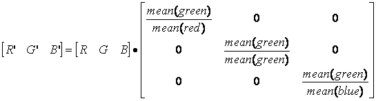 The colour balancing matrix is set to multiplicatively scale red pixel values to match the mean of all green pixels in the image, and similarly for blue pixel values. Green pixel