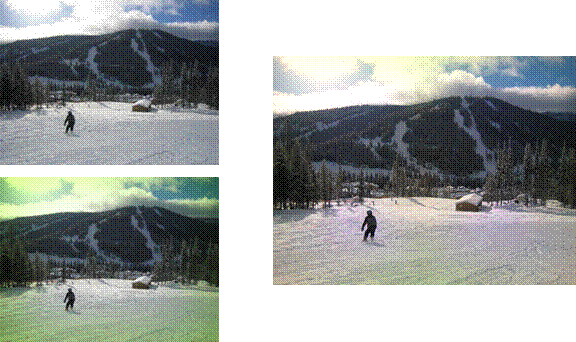Figure 14: Top Left: Original Image, Bottom Left: Distorted Image, Right: Image corrected with Localized Gray World with Linear Piece-Wise Interpolation