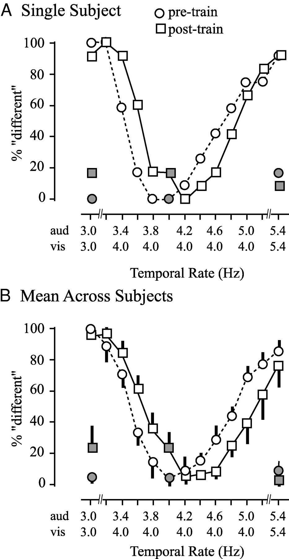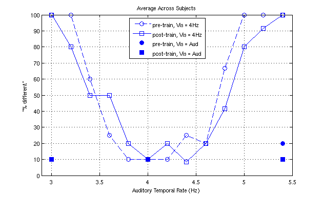 First, we look at the percentage of responses where the subject indicated the two stimuli were 'different', or not temporally aligned. This is paradigm 2 from above. Responses for both the pre- and post- training session are shown on a single graph. Clearly, a perceptual shift has occurred in the higher frequency range.
