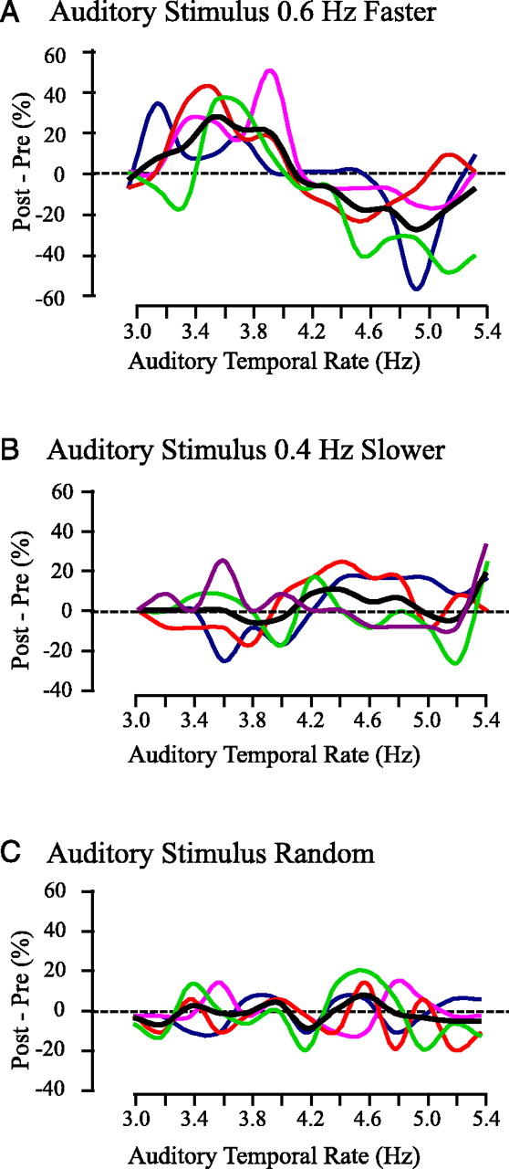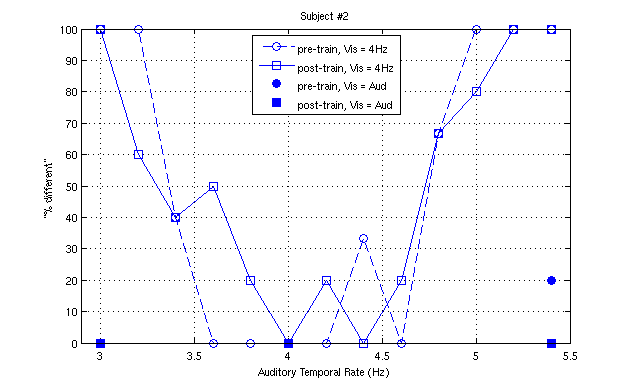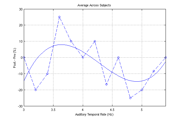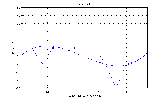 In the second figure, the difference between the post and pre responses is plotted versus frequency of the auditory stimulus. It is seen that the difference peaks at 50% for this subject - a very large shift at 4.8Hz.