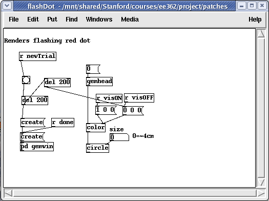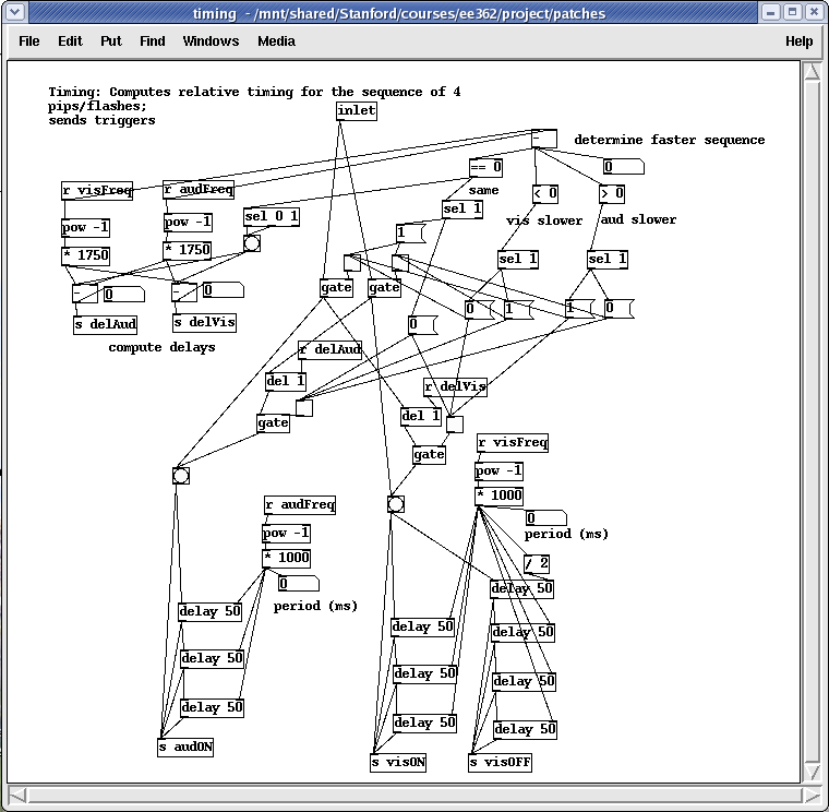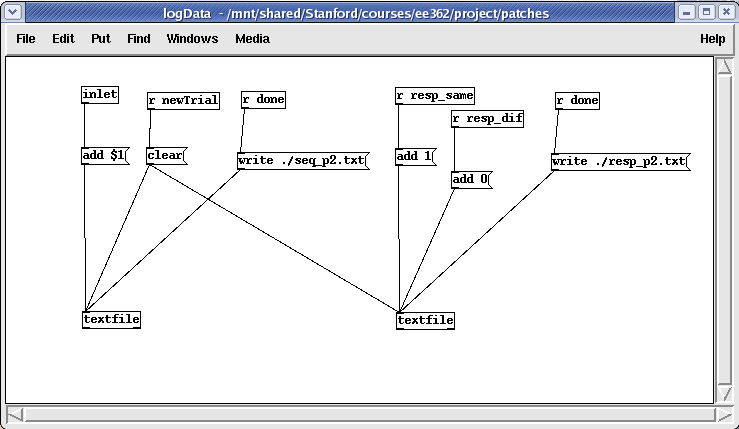 The experiment was implemented using the software package Pd. 'Pd (aka Pure Data) is a real-time graphical programming environment for audio, video, and graphical processing.' [4] There is a commercial version of the software, Max/MSP, that is virtually identical to Pd, having stemmed from the same person - Miller Puckette. The difference being that Pd is open source, and is thus widely available for all to use. Thus, the 'patches' I have created for this project can easily be downloaded, used, and modified by anyone wishing to recreate this same experiment or any variant thereof. This is especially helpful if someone is interested in changing one or two single parameters and seeing how the results are affected. Pd runs on Windows, Mac, or Linux (I used Linux for this project).