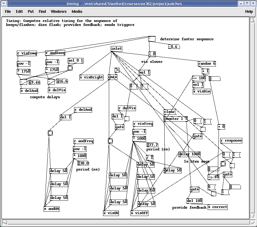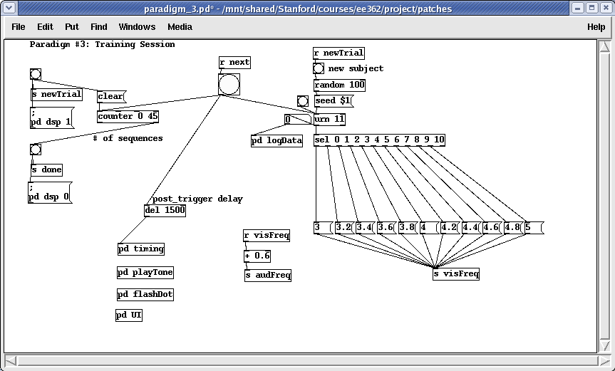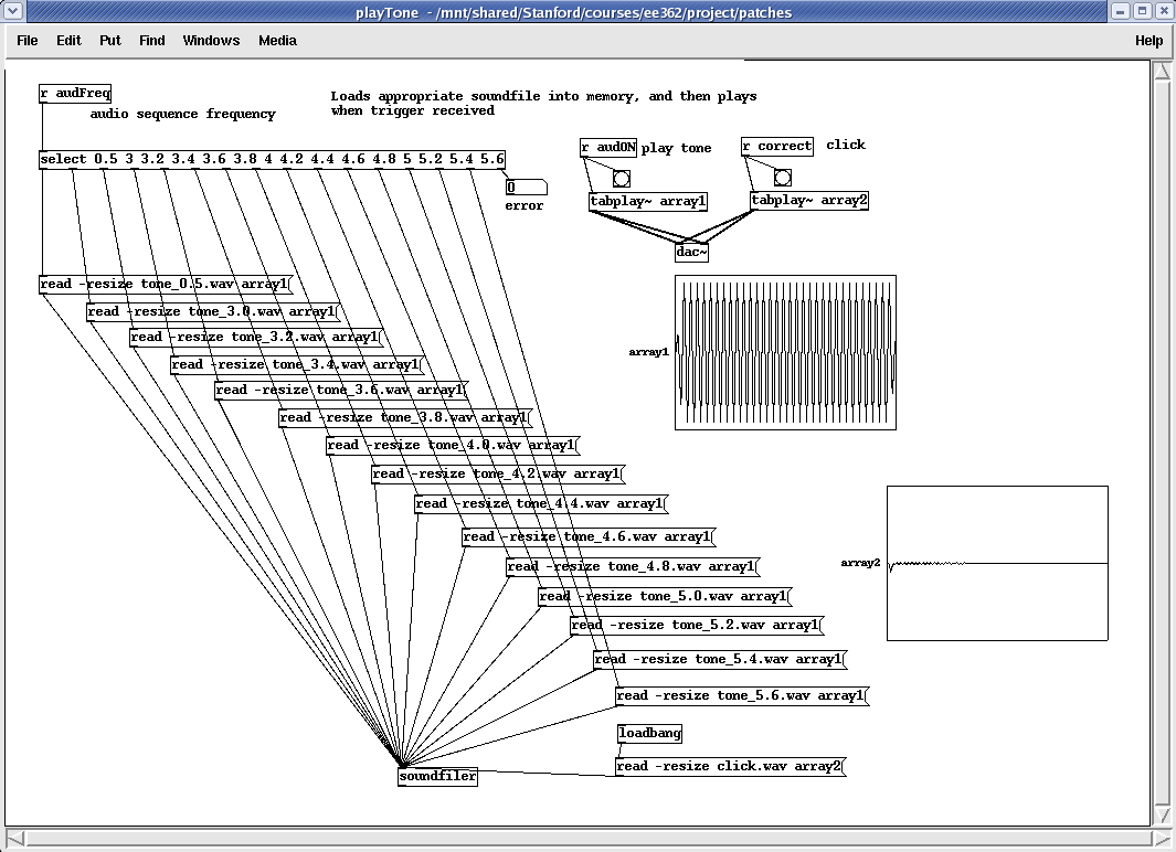 Although Pd is capable of creating the tones (one of its most basic functions), all of the test tones were synthesized beforehand to minimize the load on the CPU during the experiment. This further ensured that the timing would be as accurate as possible. The tones were created in MATLAB, and then simply loaded into Pd's memory before the experiment began.